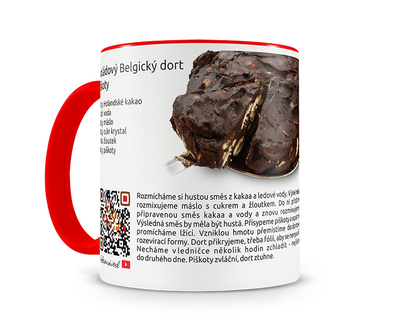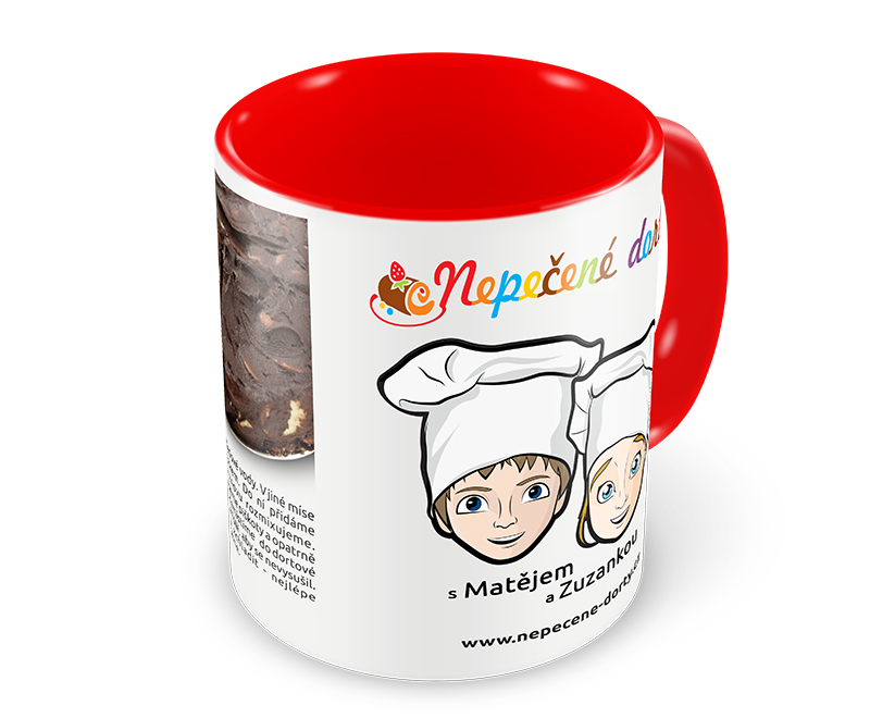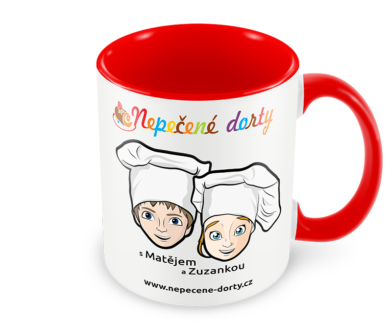Červeno-bílý hrníček s receptem a s Matějem a Zuzankou z Nepečených dortů. Recept si zvolte. Hrníček obsahuje tyto informace: