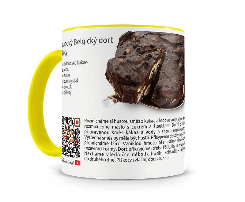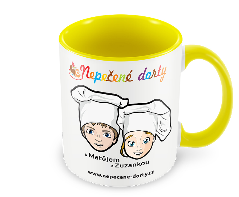 Žluto-bílý hrníček s receptem a s Matějem a Zuzankou z Nepečených dortů. Recept si zvolte. Hrníček obsahuje tyto informace: