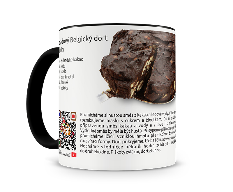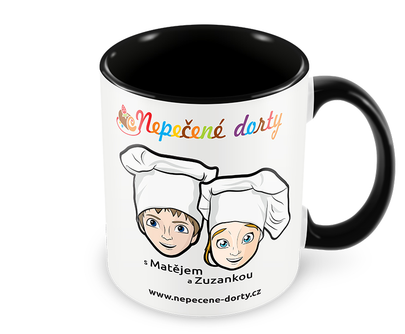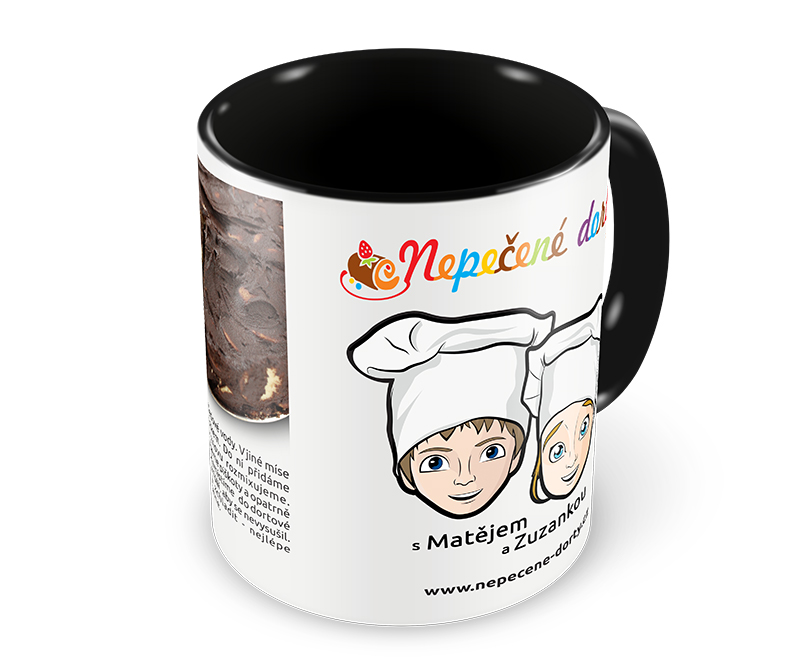 Černo-bílý hrníček s receptem a s Matějem a Zuzankou z Nepečených dortů. Recept si zvolte. Hrníček obsahuje tyto informace: