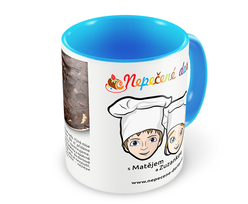 Modro-bílý hrníček s receptem a s Matějem a Zuzankou z Nepečených dortů. Recept si zvolte. Hrníček obsahuje tyto informace: